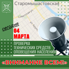 Уважаемые жители и гости Старомышастовского сельского поселения! Администрация Старомышастовского сельского поселения информирует о проведении сегодня, 4 марта 2026 года комплексной проверки готовности систем оповещения населения Краснодарского края. Что будет происходить? Уже сегодня, 4 марта 2026 года, на территории Динского района будут включены технические средства оповещения. Населению будут доведены проверочные сигналы и информационные сообщения.