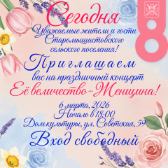 Уважаемы жители и гости Старомышастовского сельского поселения! Приглашаем вас сегодня на ПРАЗДНИЧНЫЙ КОНЦЕРТ «ЕЁ ВЕЛИЧЕСТВО-ЖЕНЩИНА!» Посвященный Международному женскому В программе: лучшие творческие номера станицы. Дата проведения: сегодня 6 марта 2026 года Начало: 18:00 Место проведения: Дом культуры, ул. Советская, 59 Вход свободный. Ждем вас!