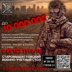 Участники СВО и их супруги имеют право на списание долгов по кредитам. Для этого нужно, чтобы были выполнены несколько условий. Подробнее процедуре и условиях можно узнать по телефону Старомышастовского военно-учетного стола (ВУС): 8(86162)7-53-18.